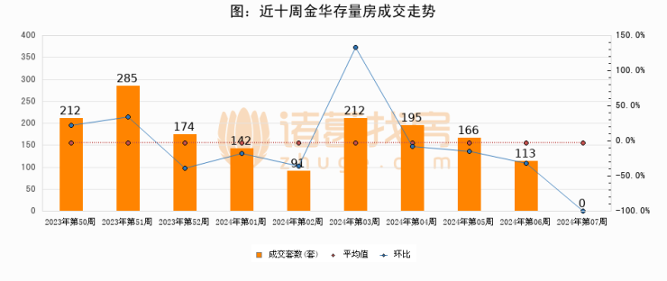 存量房方面,第06周金华存量房成交0套,较上周减少113套,环比下降100%。从近十周成交走势来看,周均成交套数为159套,本周低于平均水平100%。